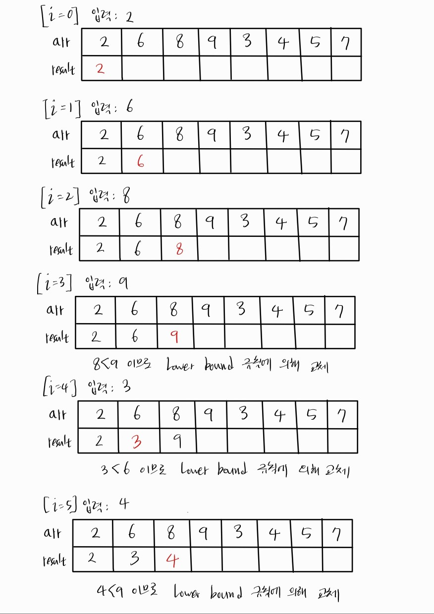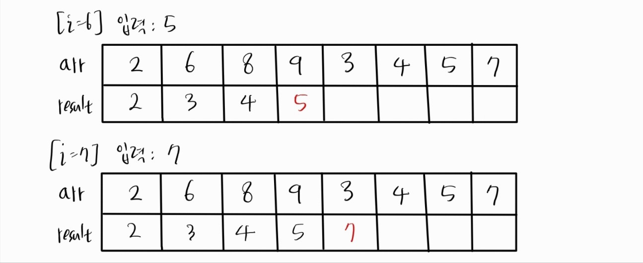 아래는 N=8, arr = [ 2, 6, 8, 9, 3, 4, 5, 7 ] 의 입력이 주어졌을 경우의 예시이다.