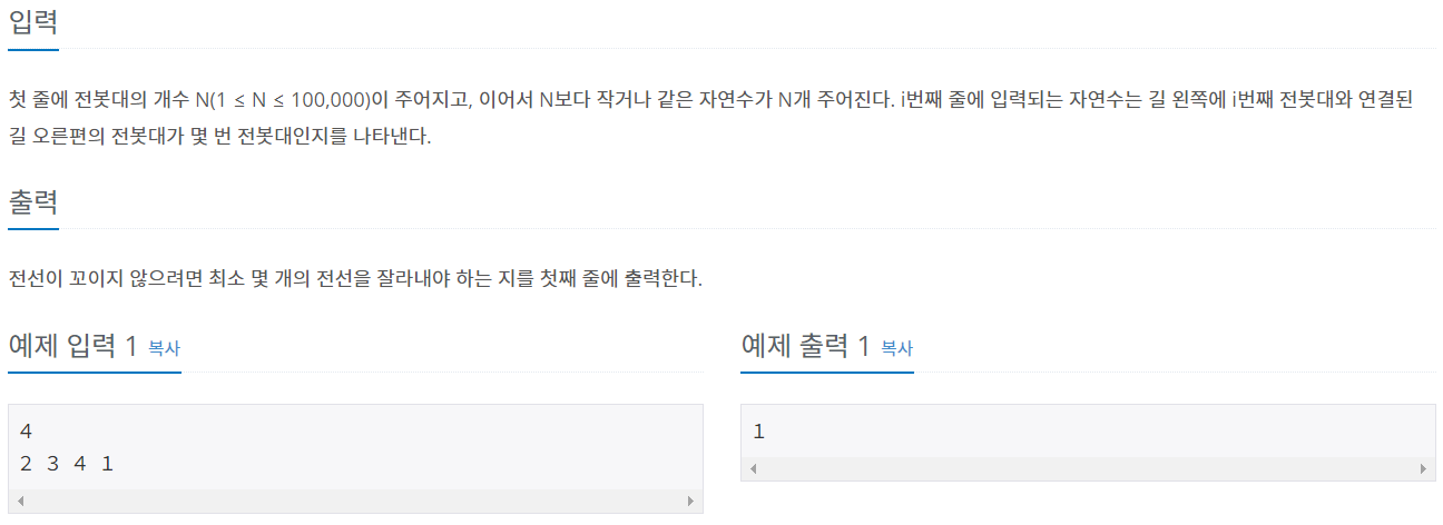 첫 줄에 전봇대의 개수 N(1 ≤ N ≤ 100,000)이 주어지고, 이어서 N보다 작거나 같은 자연수가 N개 주어진다. i번째 줄에 입력되는 자연수는 길 왼쪽에 i번째 전봇대와 연결된 길 오른편의 전봇대가