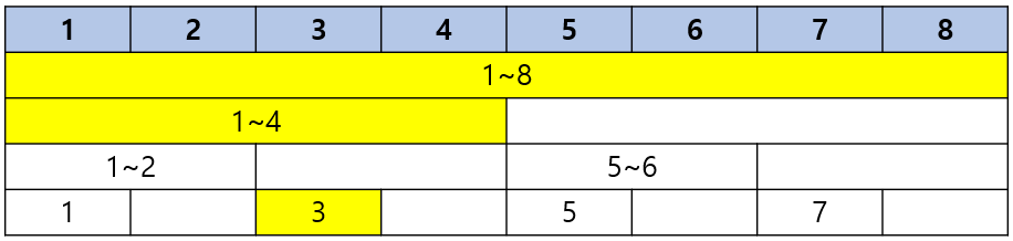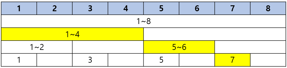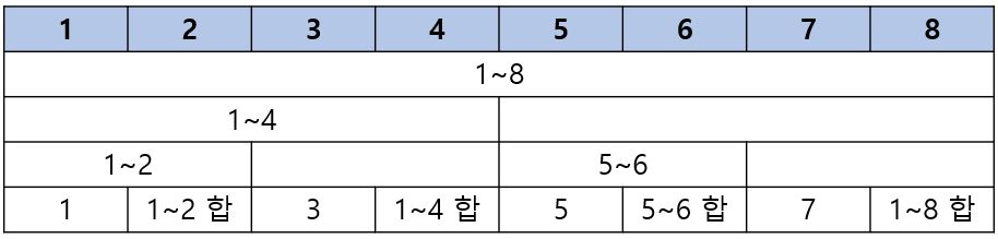 위의 그림처럼 1~4 번째 값의 합을 저장하는 인덱스 4, 5~6 번째 값의 합을 저장하는 인덱스 6, 7번 인덱스를 구할 수 있어야 한다.