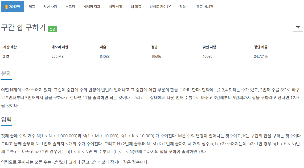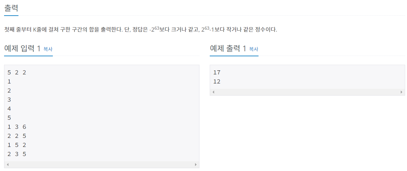 첫째 줄에 수의 개수 N(1 ≤ N ≤ 1,000,000)과 M(1 ≤ M ≤ 10,000), K(1 ≤ K ≤ 10,000) 가 주어진다. M은 수의 변경이 일어나는 횟수이고, K는 구간의 합을 구하는 횟수이다. 그리고 둘째 줄부터 N+1번째 줄
