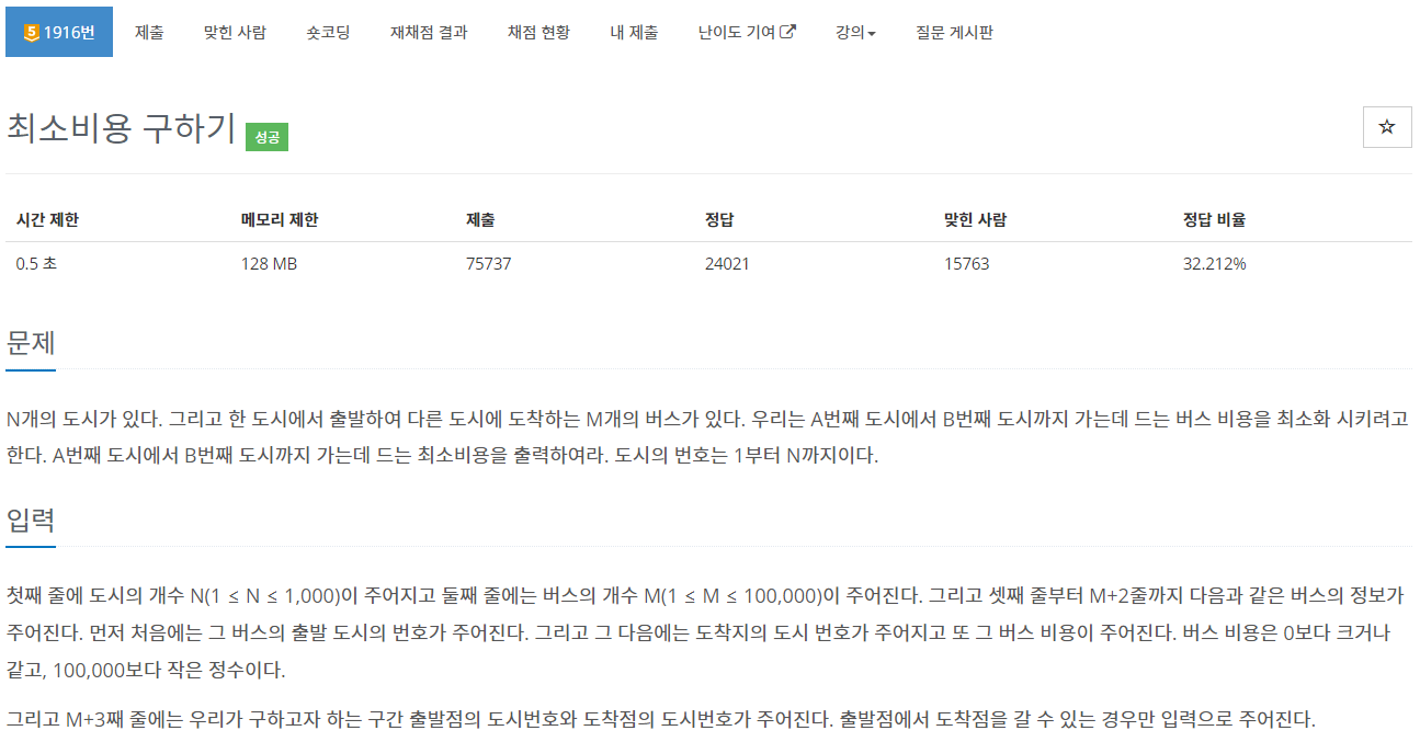 첫째 줄에 도시의 개수 N(1 ≤ N ≤ 1,000)이 주어지고 둘째 줄에는 버스의 개수 M(1 ≤ M ≤ 100,000)이 주어진다. 그리고 셋째 줄부터 M+2줄까지 다음과 같은 버스의 정보가 주어진다. 먼저 처음에는 그