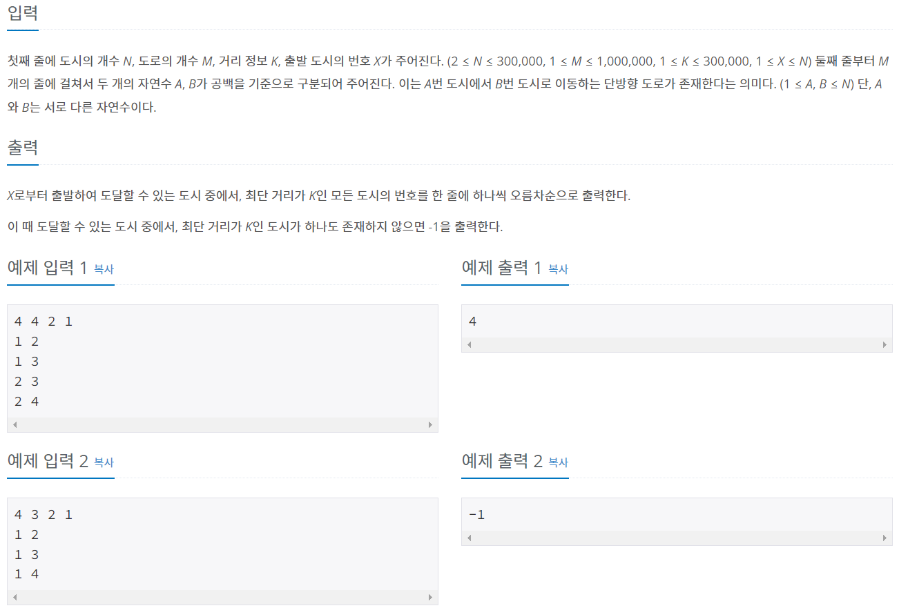 첫째 줄에 도시의 개수 N, 도로의 개수 M, 거리 정보 K, 출발 도시의 번호 X가 주어진다. (2 ≤ N ≤ 300,000, 1 ≤ M ≤ 1,000,000, 1 ≤ K ≤ 300,000, 1 ≤ X ≤ N) 둘째 줄부터 M개의 줄에 걸쳐서 두 개