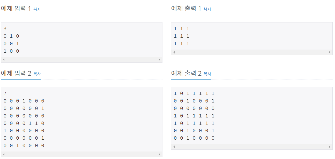 그리고 나온 결과에서 0이 아닌 수를 가진 값들은 1을 출력하고, INF는 0으로 출력하면 답을 구할 수 있다.