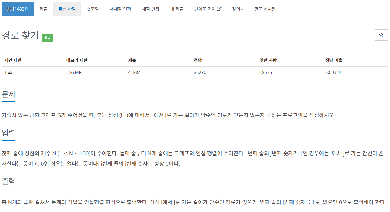 가중치 없는 방향 그래프 G가 주어졌을 때, 모든 정점 (i, j)에 대해서, i에서 j로 가는 길이가 양수인 경로가 있는지 없는지 구하는 프로그램을 작성하시오.