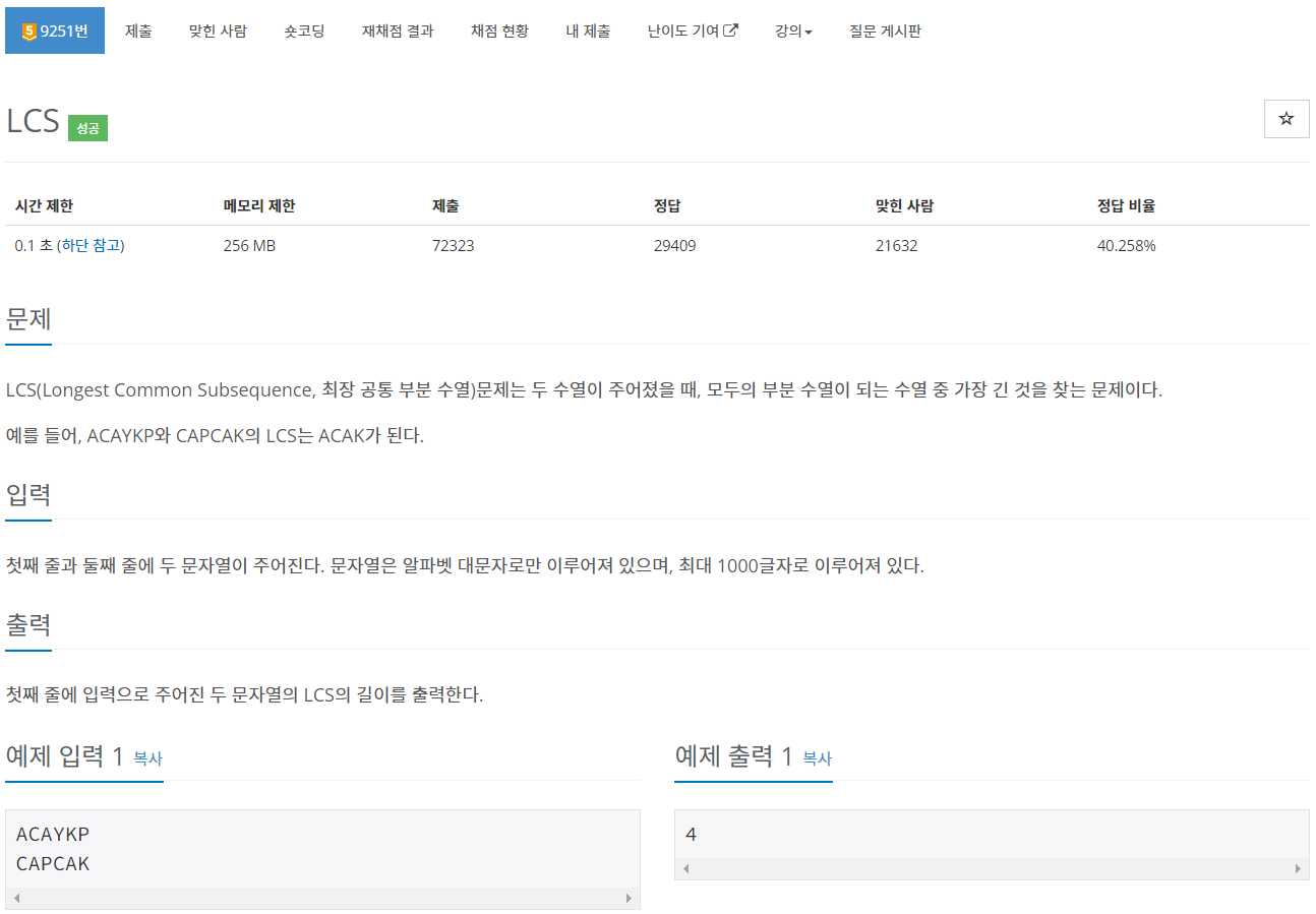 LCS(Longest Common Subsequence, 최장 공통 부분 수열)문제는 두 수열이 주어졌을 때, 모두의 부분 수열이 되는 수열 중 가장 긴 것을 찾는 문제이다. 예를 들어, ACAYKP와 CAPCAK의 LCS는 ACAK가 된다.