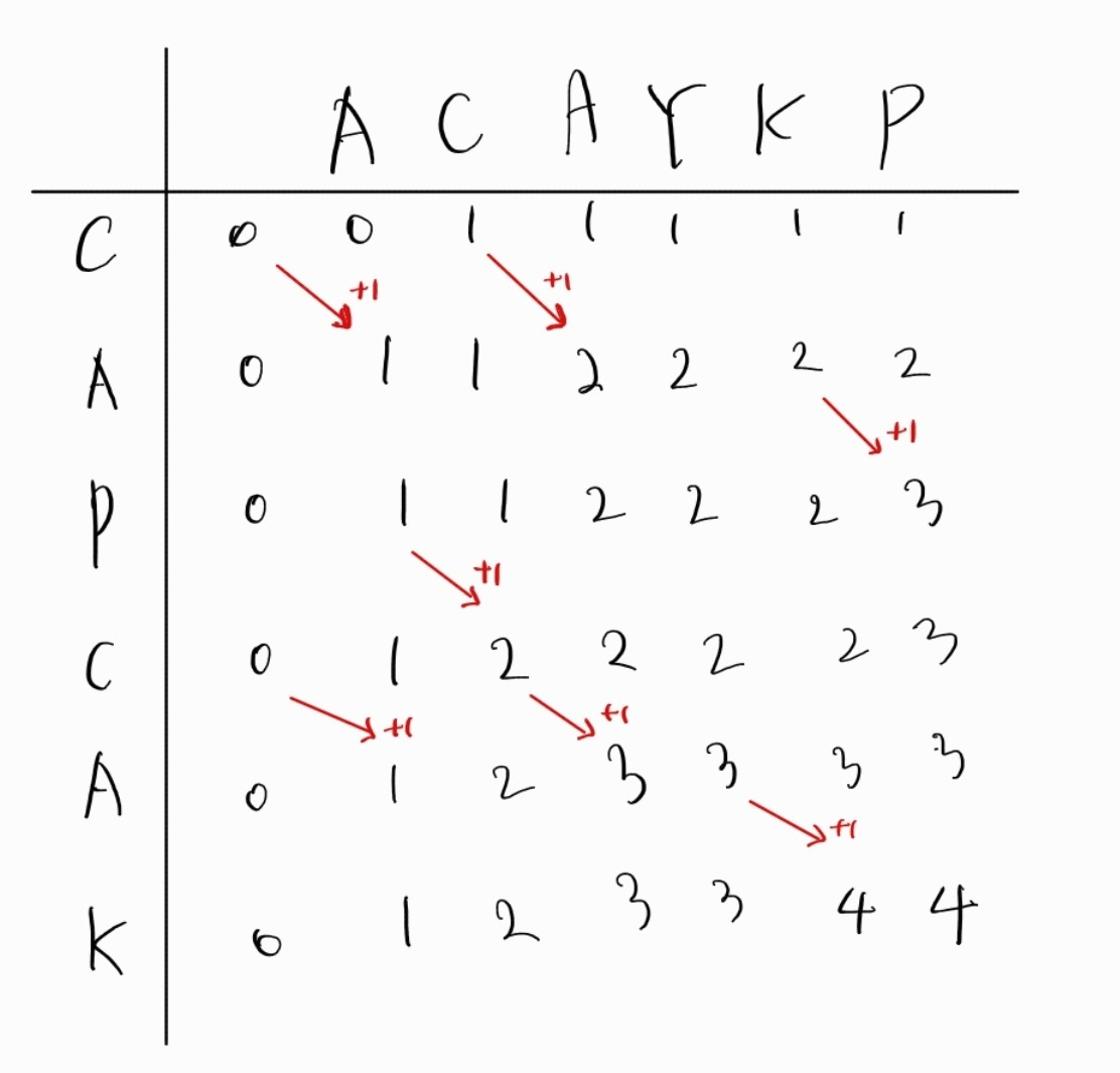 ex) d[4][2]는 첫 번째 문자열 중 {A,C}와 두 번째 문자열{CAPC} 사이의 LCS 값이 저장된다.