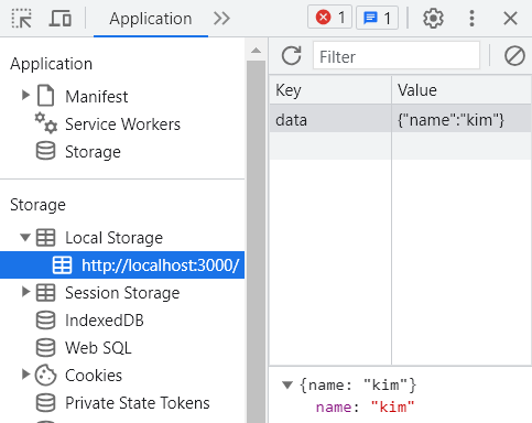 Application의 Local Storage를 확인하면 JSON 형식으로 저장된 것을 확인할 수 있다.