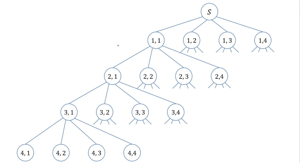 아래 그림은 N=4인 경우, 모든 경우의 수를 탐색할 수 있도록 만들어진 상태공간트리이다.