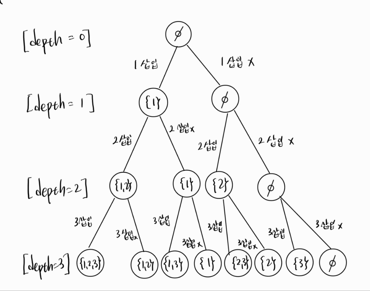 루트 노드부터 설명하면, depth=1에서는 1이라는 원소가 삽입되는 경우 왼쪽 노드, 삽입되지 않는 경우