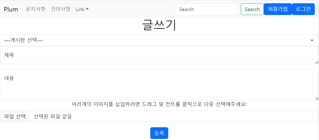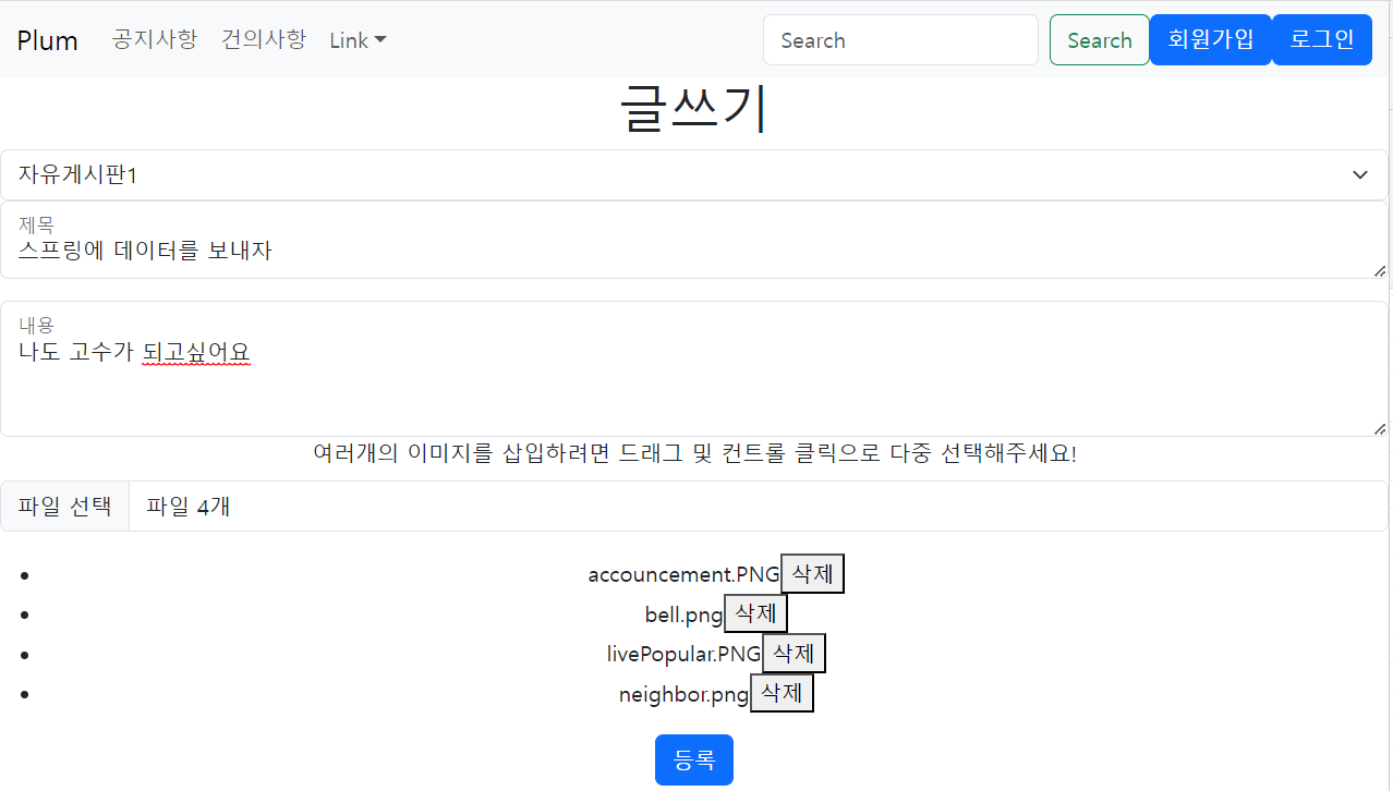 위처럼 게시판 종류, 제목, 내용, 파일들을 입력하고 등록버튼을 통해 스프링에 데이터를 전송할 것이다.