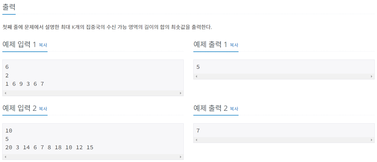 K개의 집중국을 통해 최소 수신 가능 범위를 구하는 문제입니다.