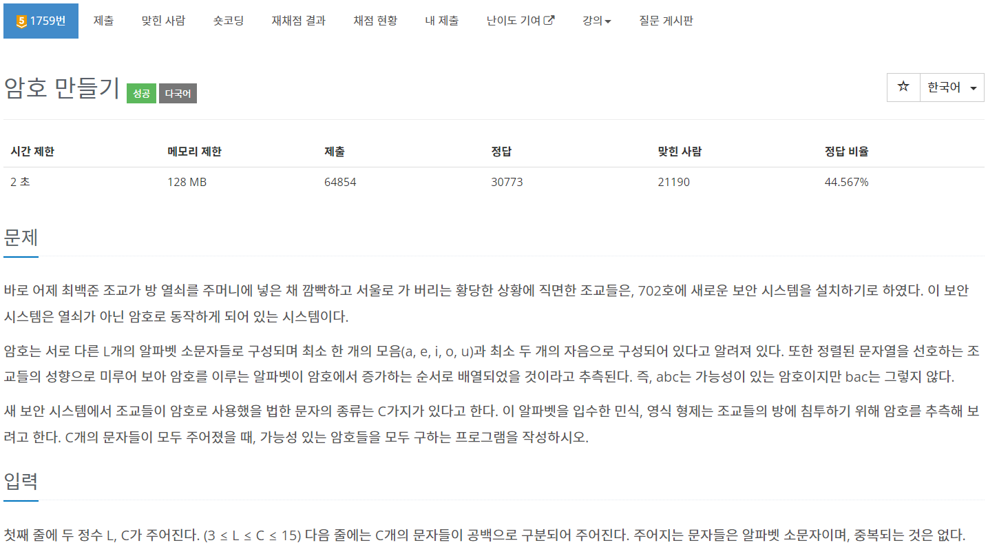 따라서 조합으로 구하는 경우의 수 중, 모음과 자음의 개수가 조건에 충족되는 경우 출력하면