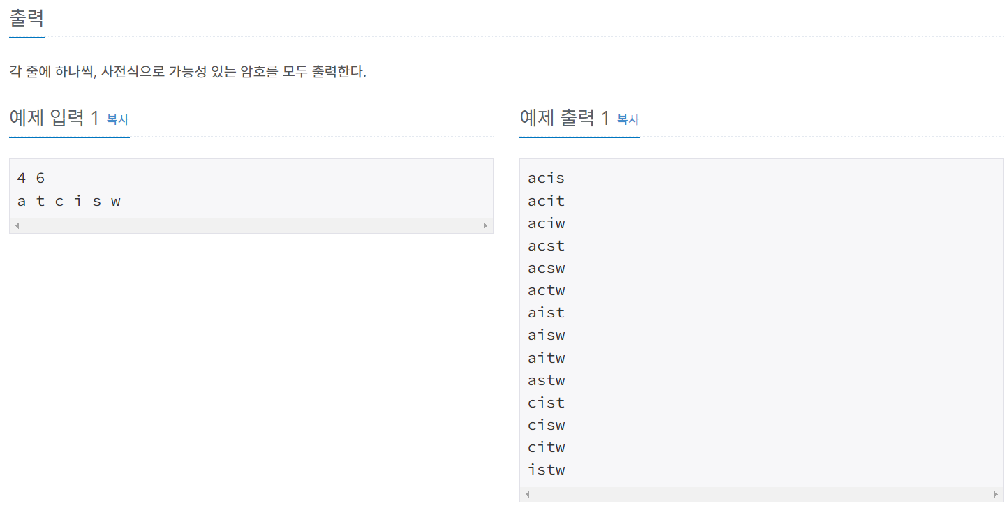 첫째 줄에 두 정수 L, C가 주어진다. (3 ≤ L ≤ C ≤ 15) 다음 줄에는 C개의 문자들이 공백으로 구분되어 주어진다. 주어지는 문자들은 알파벳 소문자이며, 중복되는 것은 없다.