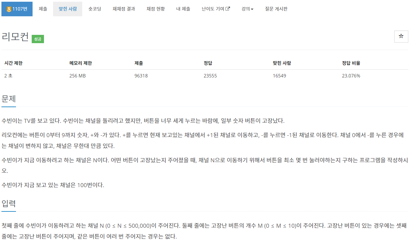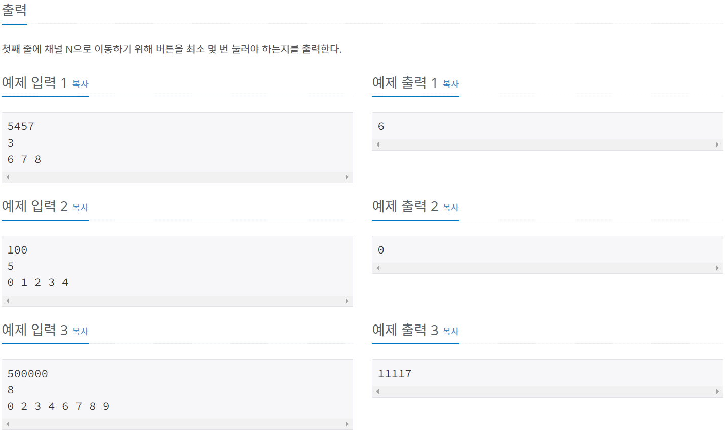 첫째 줄에 수빈이가 이동하려고 하는 채널 N (0 ≤ N ≤ 500,000)이 주어진다. 둘째 줄에는 고장난 버튼의 개수 M (0 ≤ M ≤ 10)이 주어진다. 고장난 버튼이 있는 경우에는 셋째 줄에는 고장난 버튼이