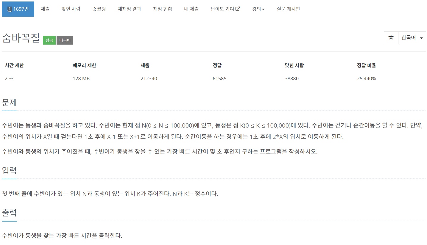 수빈이는 동생과 숨바꼭질을 하고 있다. 수빈이는 현재 점 N(0 ≤ N ≤ 100,000)에 있고, 동생은 점 K(0 ≤ K ≤ 100,000)에 있다. 수빈이는 걷거나 순간이동을 할 수 있다. 만약, 수빈이의 위치가 X일