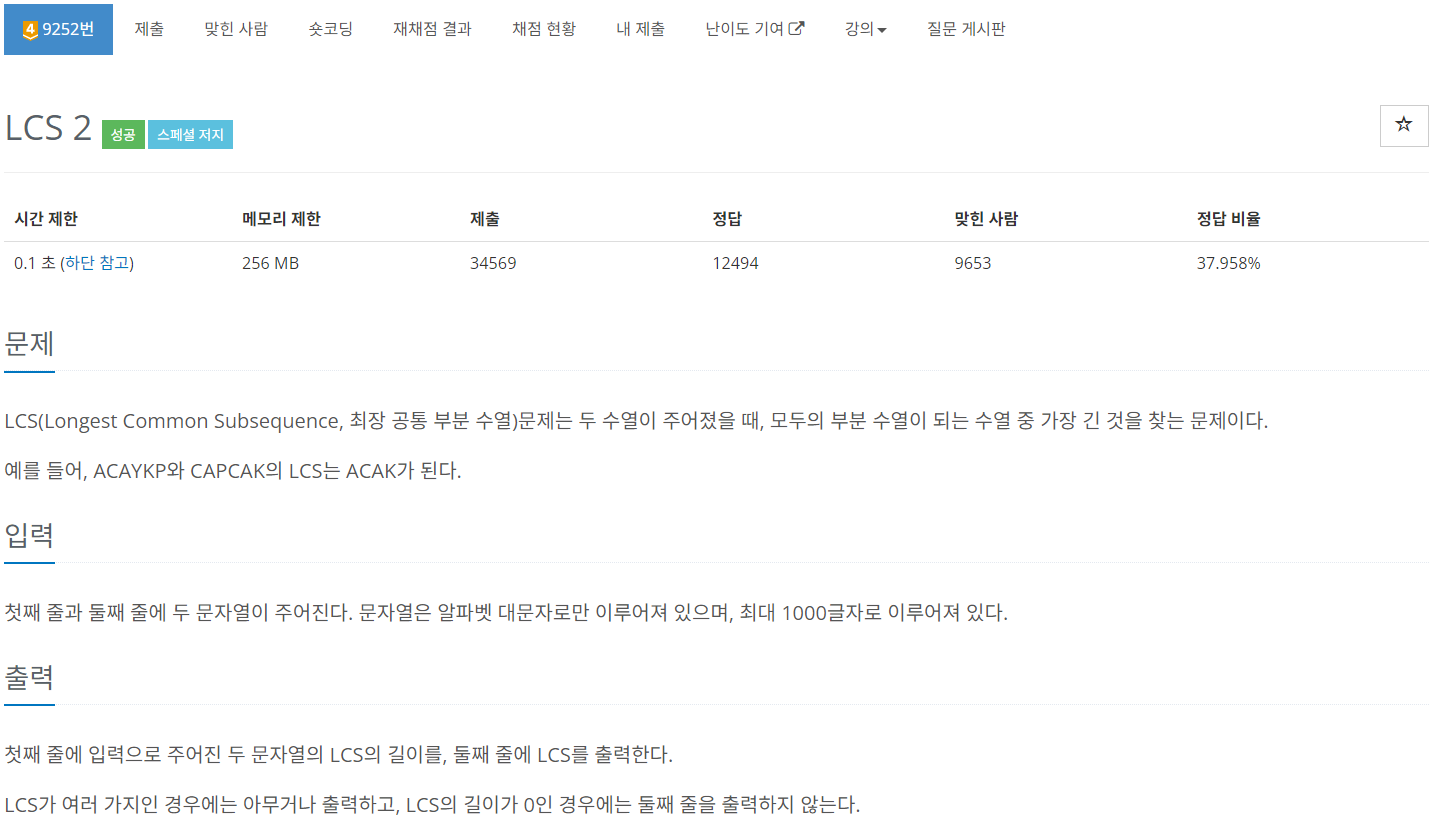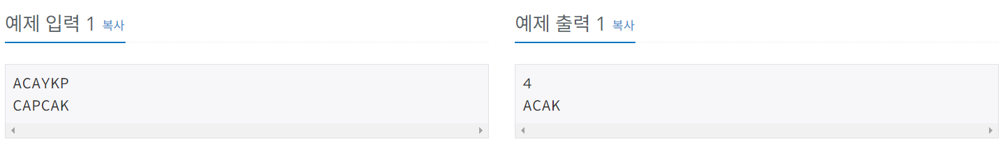 LCS(Longest Common Subsequence, 최장 공통 부분 수열)문제는 두 수열이 주어졌을 때, 모두의 부분 수열이 되는 수열 중 가장 긴 것을 찾는 문제이다. 예를 들어, ACAYKP와 CAPCAK의 LCS는 ACAK가 된다.