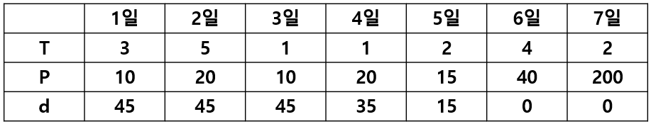 5일 : T5 = 2로 (5+T5 = 7), 업무 마지막날인 7일까지 작업을 마칠 수 있으므로 d[5]=P5=15