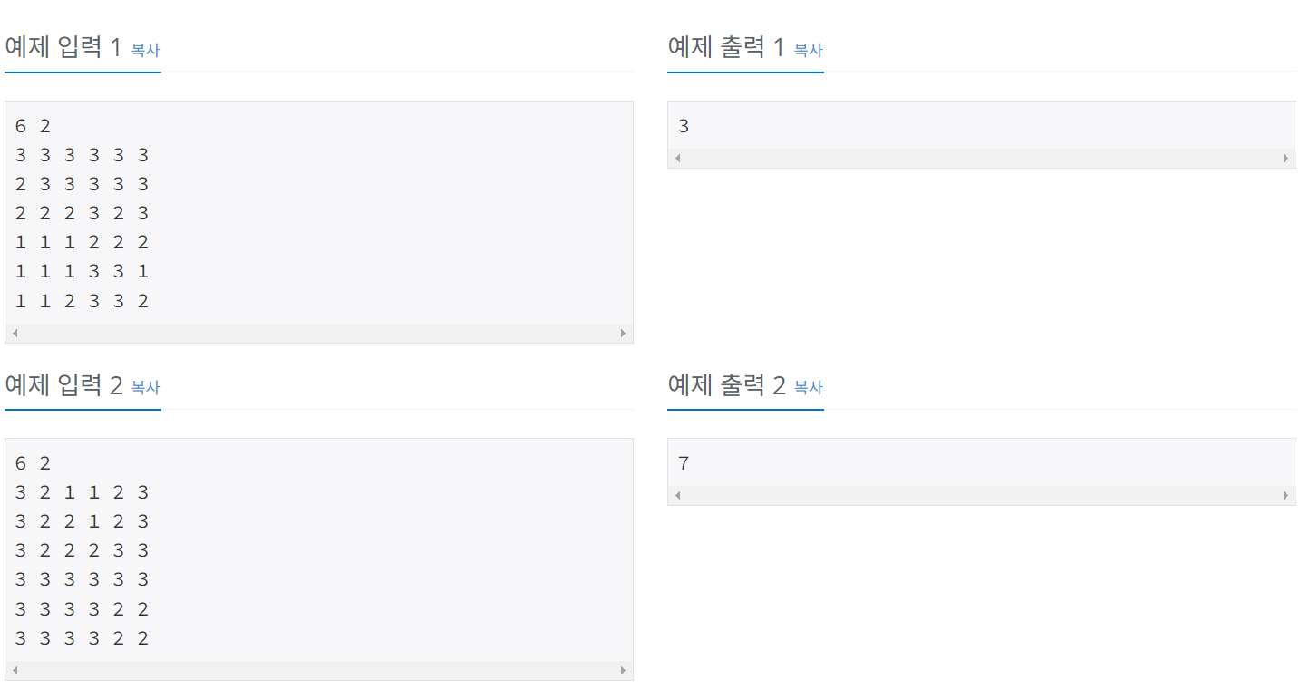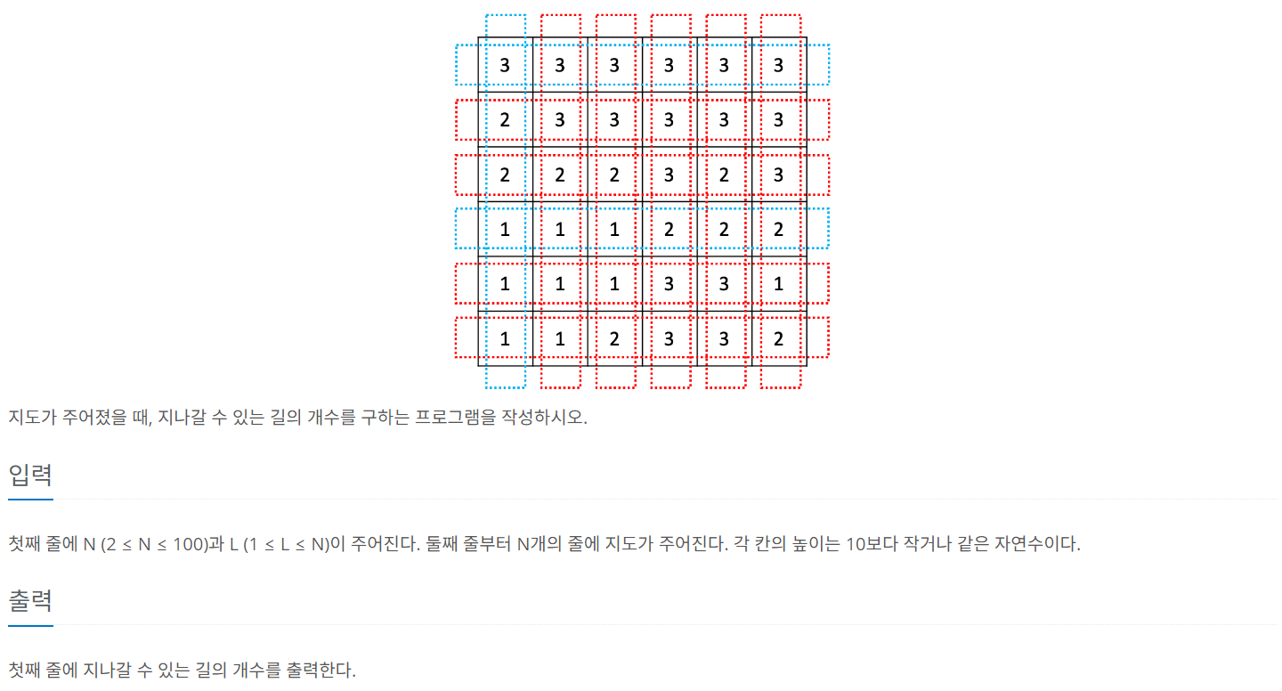 첫째 줄에 N (2 ≤ N ≤ 100)과 L (1 ≤ L ≤ N)이 주어진다. 둘째 줄부터 N개의 줄에 지도가 주어진다. 각 칸의 높이는 10보다 작거나 같은 자연수이다.