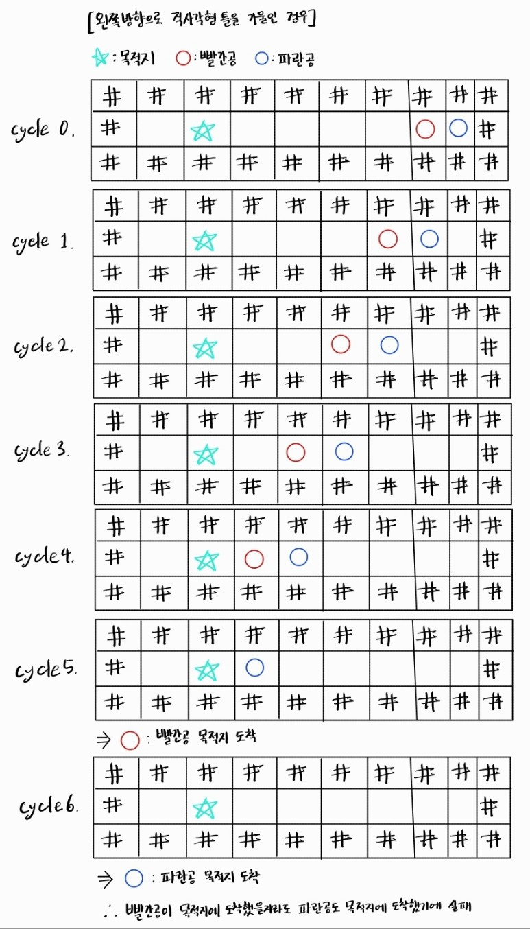 - 이동 방향에 따라 빨간공 또는 파란공의 이동 우선순위를 구분하여 이동시킨다.