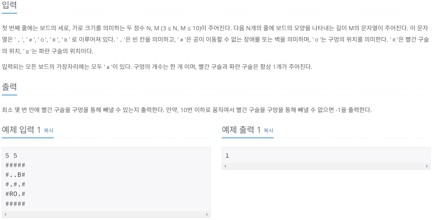 첫 번째 줄에는 보드의 세로, 가로 크기를 의미하는 두 정수 N, M (3 ≤ N, M ≤ 10)이 주어진다. 다음 N개의 줄에 보드의 모양을 나타내는 길이 M의 문자열이 주어진다. 이 문자열은 '.', '#', 'O', 'R', 'B'