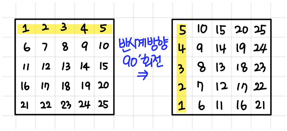 이차원 배열을 반시계 방향으로 90도 회전시켜야한다.