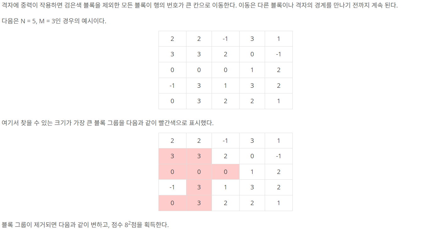 3. 2번에서 찾은 블록 그룹을 삭제하고, 해당 블록 그룹의 크기의 제곱의 수만큼의 점수를 획득한다.