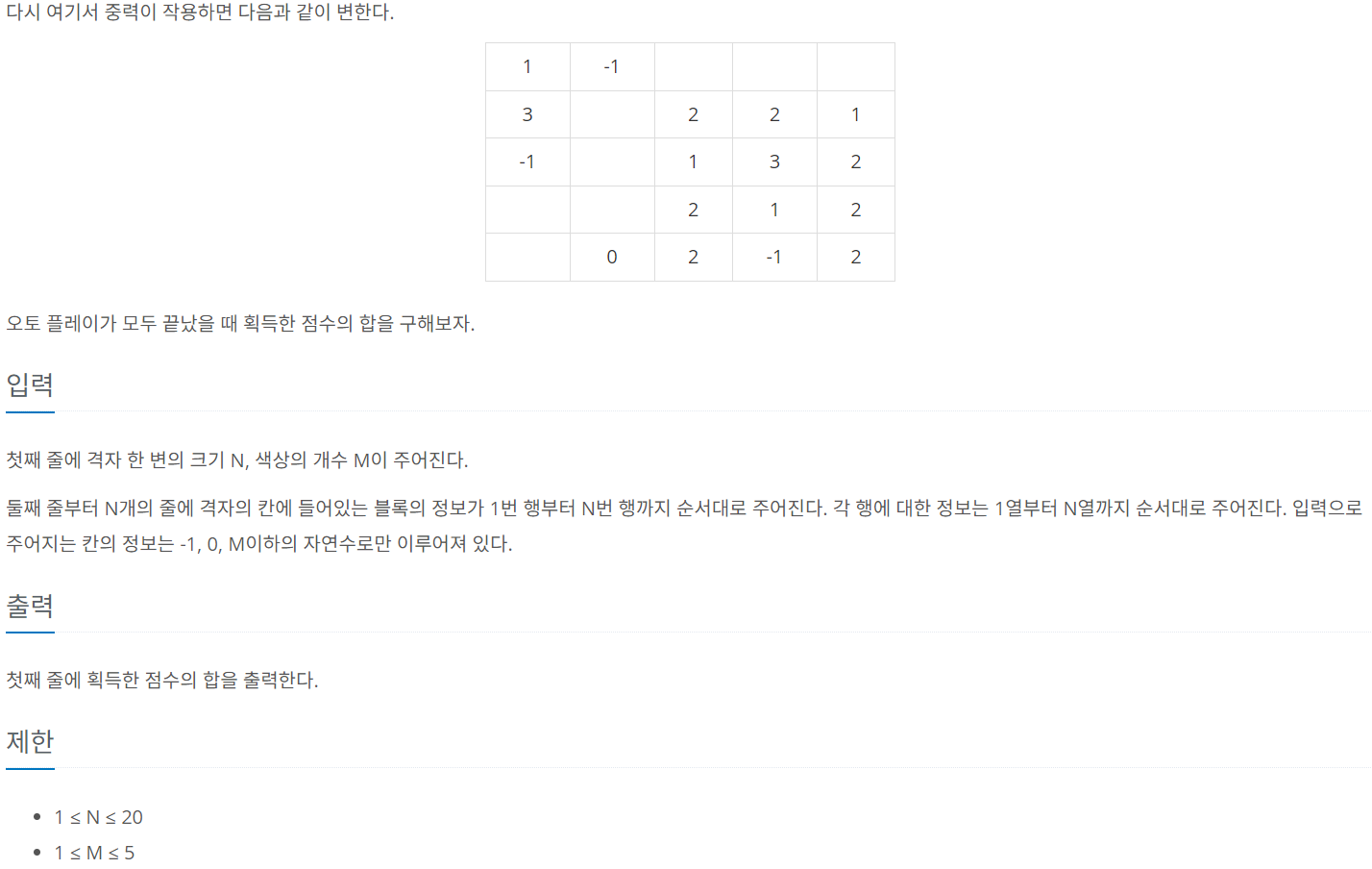 1. 격자 한 변의 크기, 색상의 개수와 각 격자 칸에 들어있는 블록의 정보를 입력받는다.