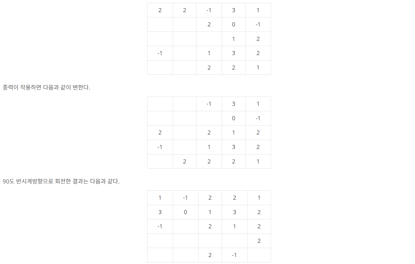 4. 격자에 중력을 작용시켜, 삭제되어 빈 블록 위에 일반 블록이 있다면 위치를 뒤바꿔 이동시킨다.