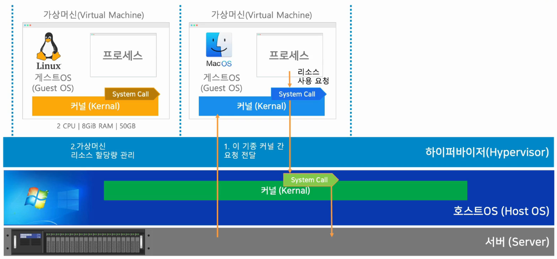 - 따라서 게스트 OS와 호스트 OS가 다르면, 호스트 OS는 게스트 OS에서 전달받은 System Call을 이해하지 못해 요청을 처리할 수가 없다.
