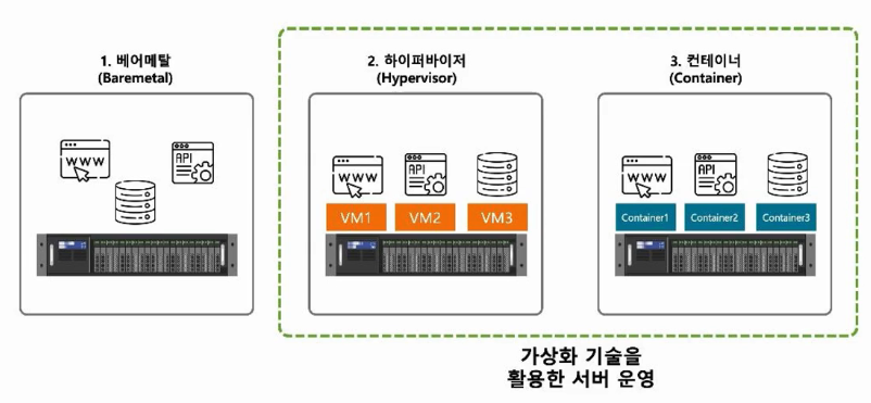 - 베어메탈(Baremetal) 방식 : 물리적인 하나의 서버 위에 하나의 OS를 설치하여 여러 개의 소프트웨어를 실행