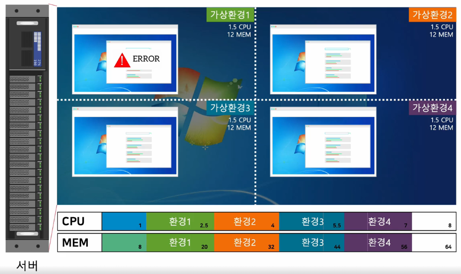 - 낮은 사양의 컴퓨터를 여러 대 사용하는 것 보다, 높은 사양의 컴퓨터를 한 대 사용하는 것이 가격, 설치 공간, 설치 인력, 서버 운영, 하드웨어 사이즈나 배선 등에서 이점