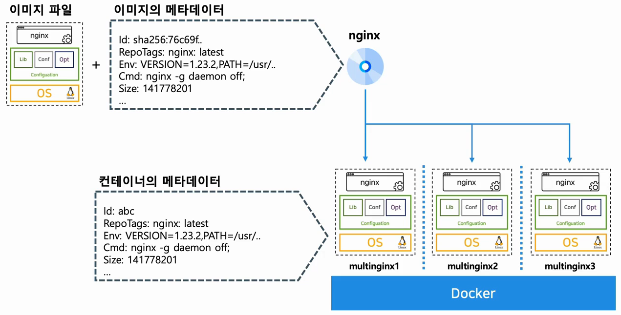 - 지정한 이미지의 압축파일과 이미지의 메타데이터를 사용해서 격리된 공간인 컨테이너를 만들어낸다.
