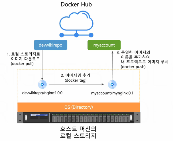 (도커허브에서 프로젝트의 이름은 도커 사용자의 계정명인데, 해당 이미지를 내 이미지 레지스트리로 옮기고 싶을 때 tag 명령을 통해 이미지의 프로젝트명을 변경하고, 내 이미지 레지스트리로 push하여 업로드할 수 있다.)