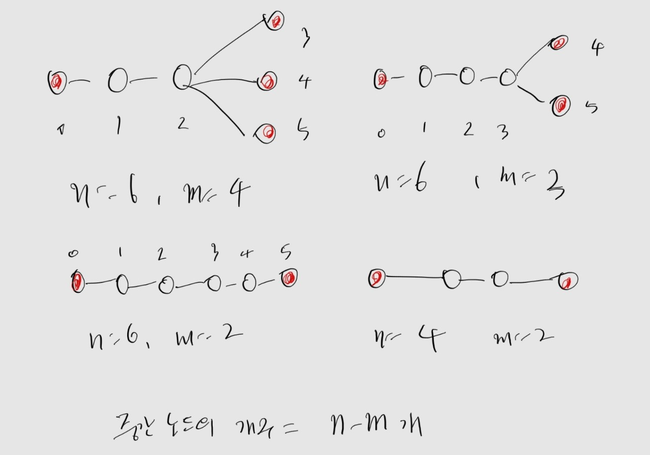 예로 n=6, m=4일 때, 0번 노드가 하나의 리프노드이므로 2개의 중간 노드를 두고