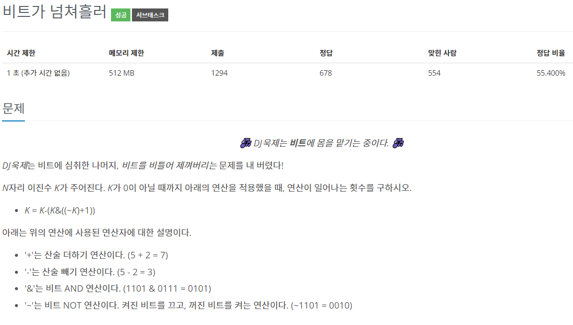 문제에서 주어진 식 k=k-(k&((~K)+1))에 대한 이해가 필요하다.