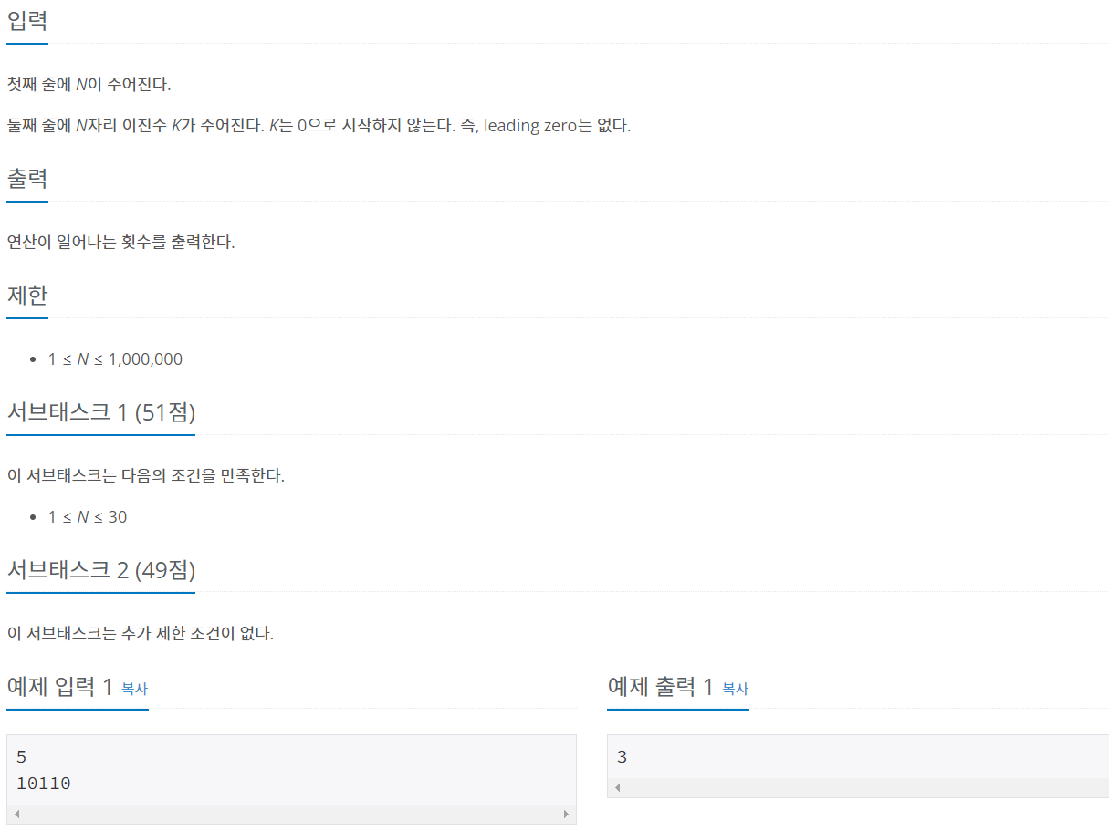 🎶 DJ욱제는 비트에 몸을 맡기는 중이다. 🎶 DJ욱제는 비트에 심취한 나머지, 비트를 비틀어 제껴버리는 문제를 내 버렸다! N자리 이진수 K가 주어진다. K가 0이 아닐 때까지 아래의 연산을 적용
