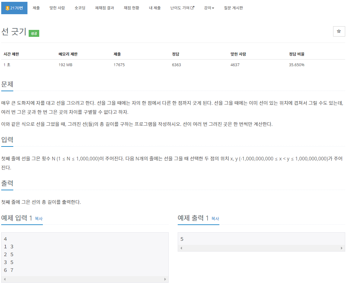 1. 입력 받은 선들을 시작점 기준으로 오름차순 정렬한다.