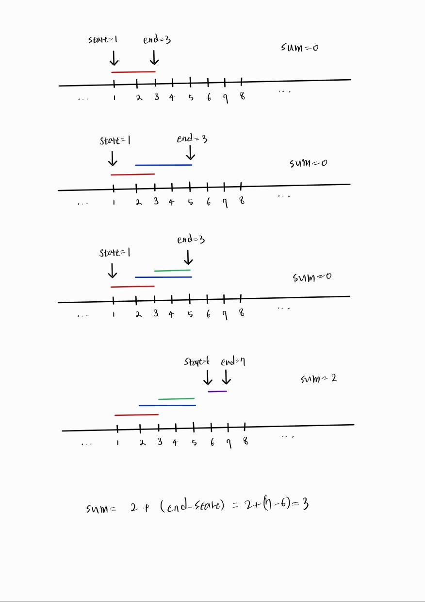 4. 위 3번 과정에서 start가 변할 때마다 변경하기 전의 end-start 값을 총 합계에 합산한다.