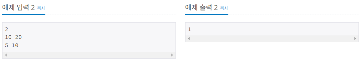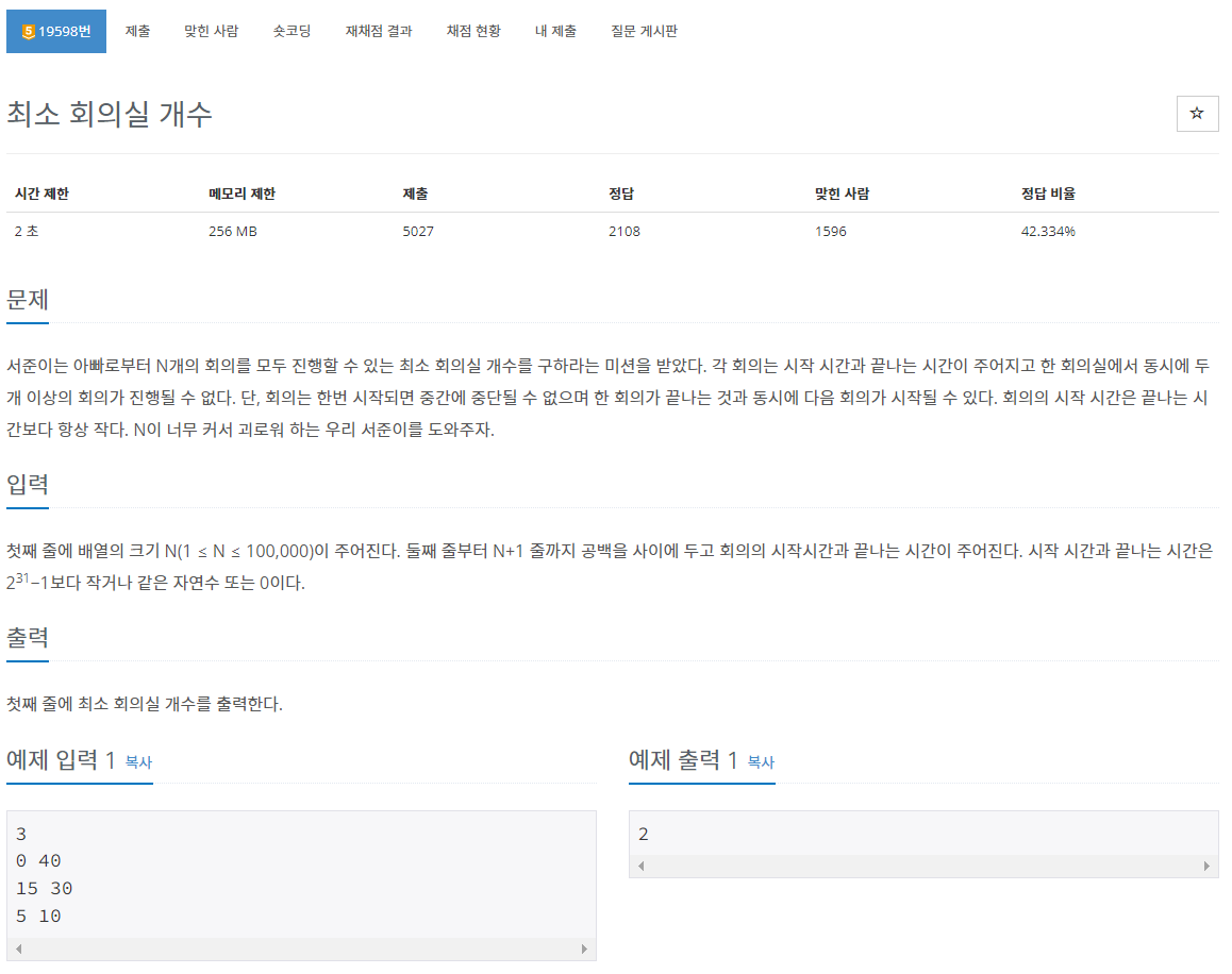 서준이는 아빠로부터 N개의 회의를 모두 진행할 수 있는 최소 회의실 개수를 구하라는 미션을 받았다. 각 회의는 시작 시간과 끝나는 시간이 주어지고 한 회의실에서 동시에 두 개 이상의 회의