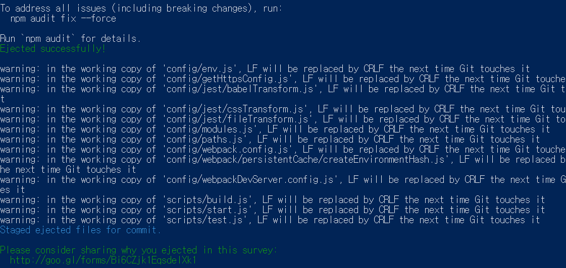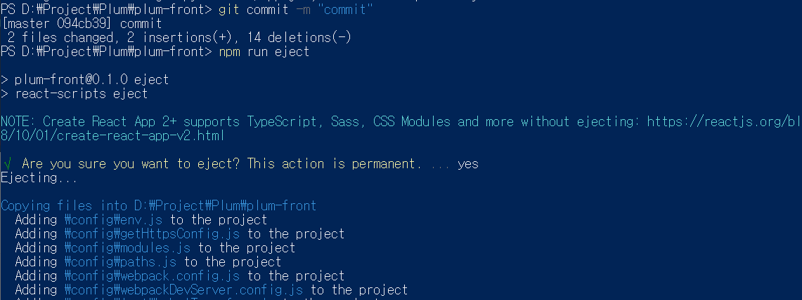 전과 달리 성공적으로 npm run eject 명령어가 실행되는 것을 확인할 수 있다.