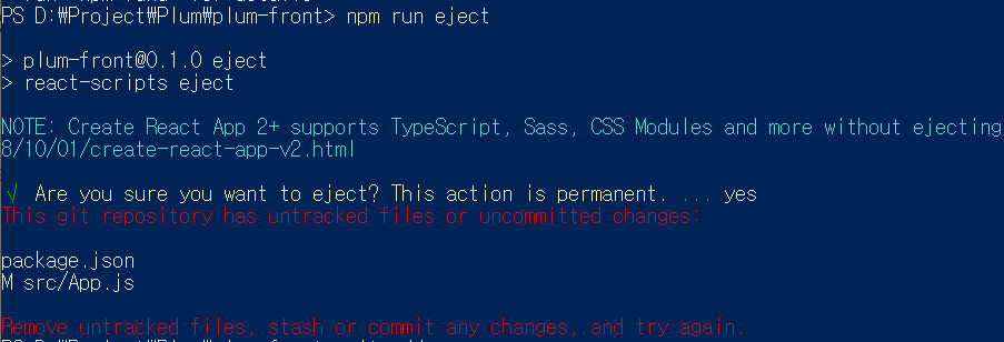 npm run eject 명령어를 실행했는데 아래와 같은 오류가 발생했다.