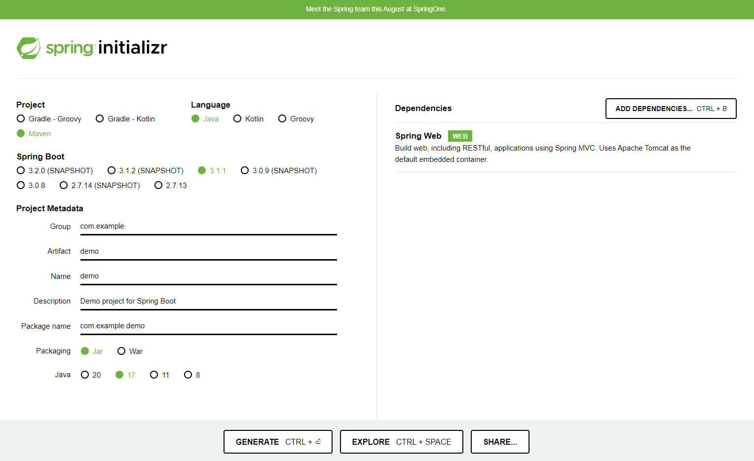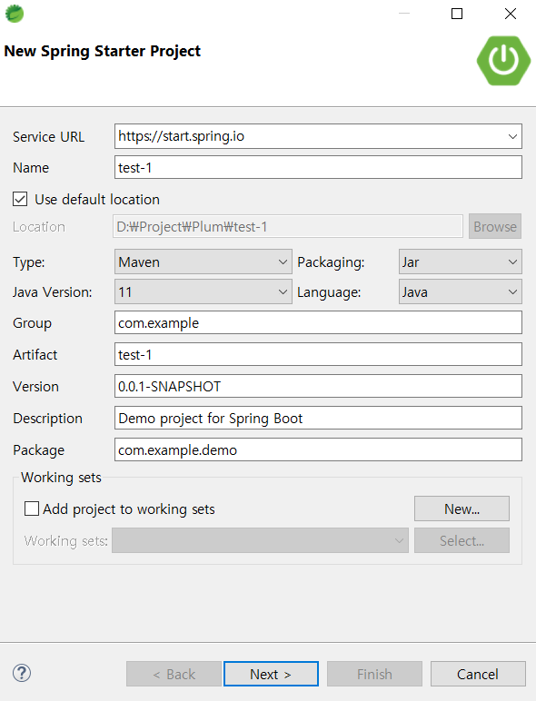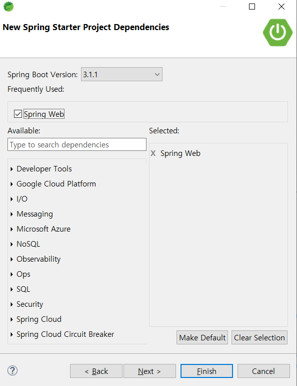 Spring Web Dependency가 추가된 상태로 이클립스로 File->New->Spring Starter Project를 실행한다.