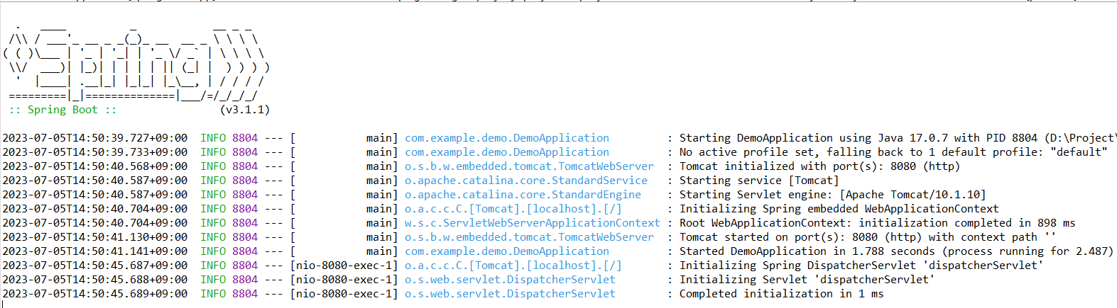 프로젝트를 실행시키고 위와 같은 화면이 콘솔창에 출력되면 프로젝트가 성공적으로 생성된 것이다.