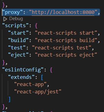 React 프로젝트 폴더->package.json 파일에서scripts 위에 "proxy": "http://localhost:8080" 을 입력하여 중간에 프록시를 생성한다.